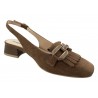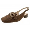 CHAUSSURE CROUTE DE CUIR FAUVE FERMEE DEVANT ET OUVERTE AU TALON. FRANGE ET JOLI BIJOU.