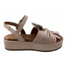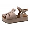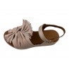 SANDALE PLATE CUIR ROSE POUDRE SUR PLATEAU. DRAPPE SUR LE DESSUS IDEAL POUR CACHER LES ORTEILS. COCO ABRICOT